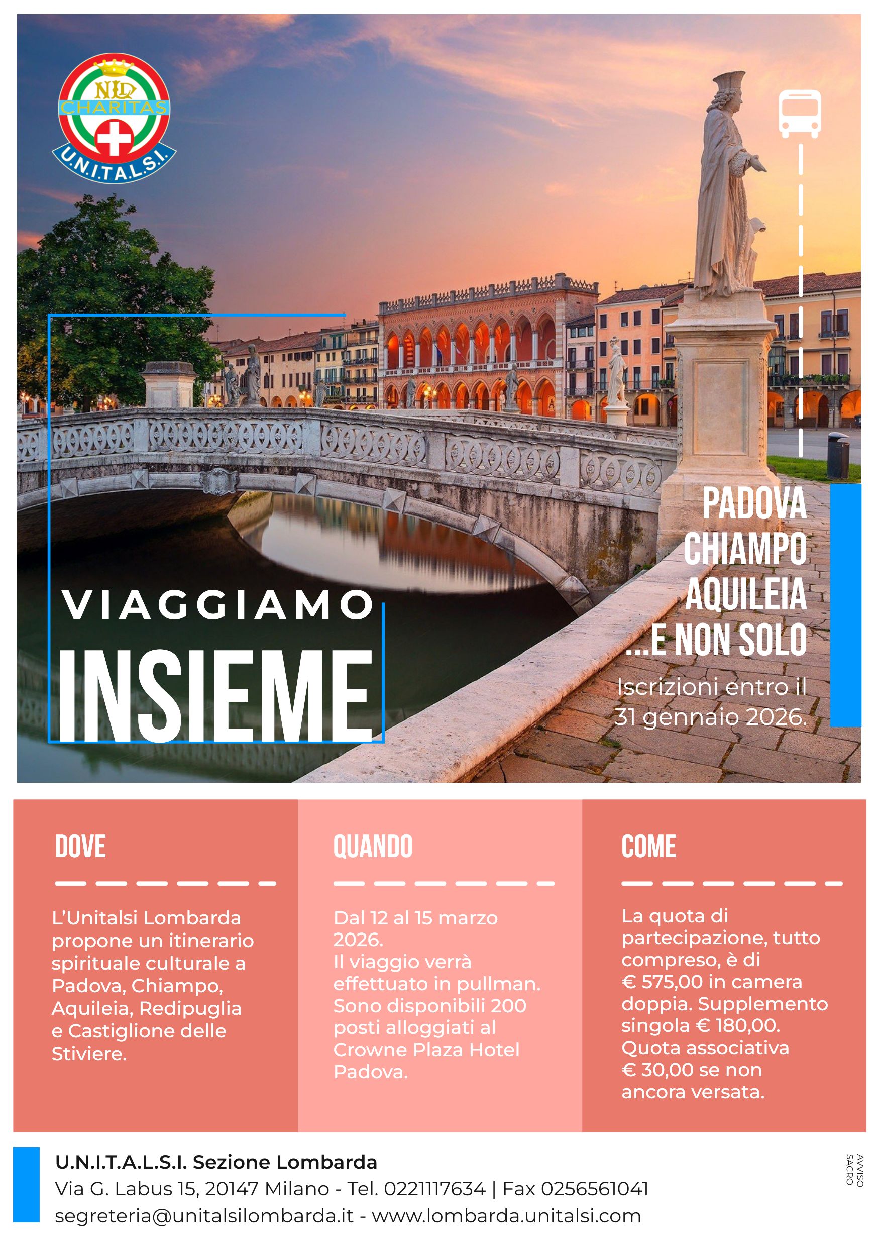L’UNITALSI Lombarda propone un itinerario spirituale culturale a Padova, Chiampo, Aquileia, Redipuglia e Castiglione delle Stiviere dal 12 al 15 marzo 2026.